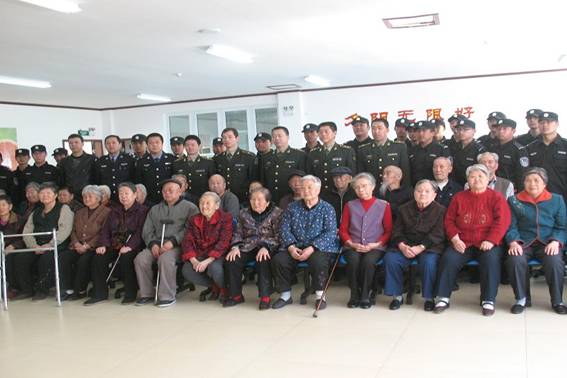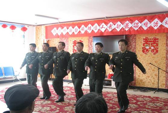 为继承和发扬人武部队尊老、敬老的优良传统,4月1日上午,白碱滩区区委常委、人民武装部政委秦宏杰,带领官兵和防暴民兵40余人,带着大米、日用品以及精心准备的节目,来到为老服务中心开展“送温暖”活动。在中心活动室看到期盼等待他们的老人们,官兵们感动不已。他们用自己整齐的步伐、嘹亮的军歌,感染着在场的每一位老人。文艺活动在激动的氛围中拉开帷幕,一曲整齐、嘹亮的大合唱《没有共产党就没有新中国》闪亮登场,老人们为之动容,跟官兵们一起放声高歌。接着,一个个精彩的节目接踵而来,吉他伴奏的小合唱《歌颂祖国》、《献给妈妈的歌》,传递着官兵们对老人的深厚情谊。防暴民警的军体拳表演虎虎生威赢得阵阵掌声,一首熟悉的旋律《掀起你的盖头来》音乐声响起,武装官兵、中心员工和老人们跳起了欢快的新疆舞蹈,互动节目“击鼓传花”拉近了官兵与老人的距离,在官兵们合唱《向前进》歌声中本次活动落下帷幕。最后,一张普通的合影照片,为这次活动留下了难忘永久的记忆。